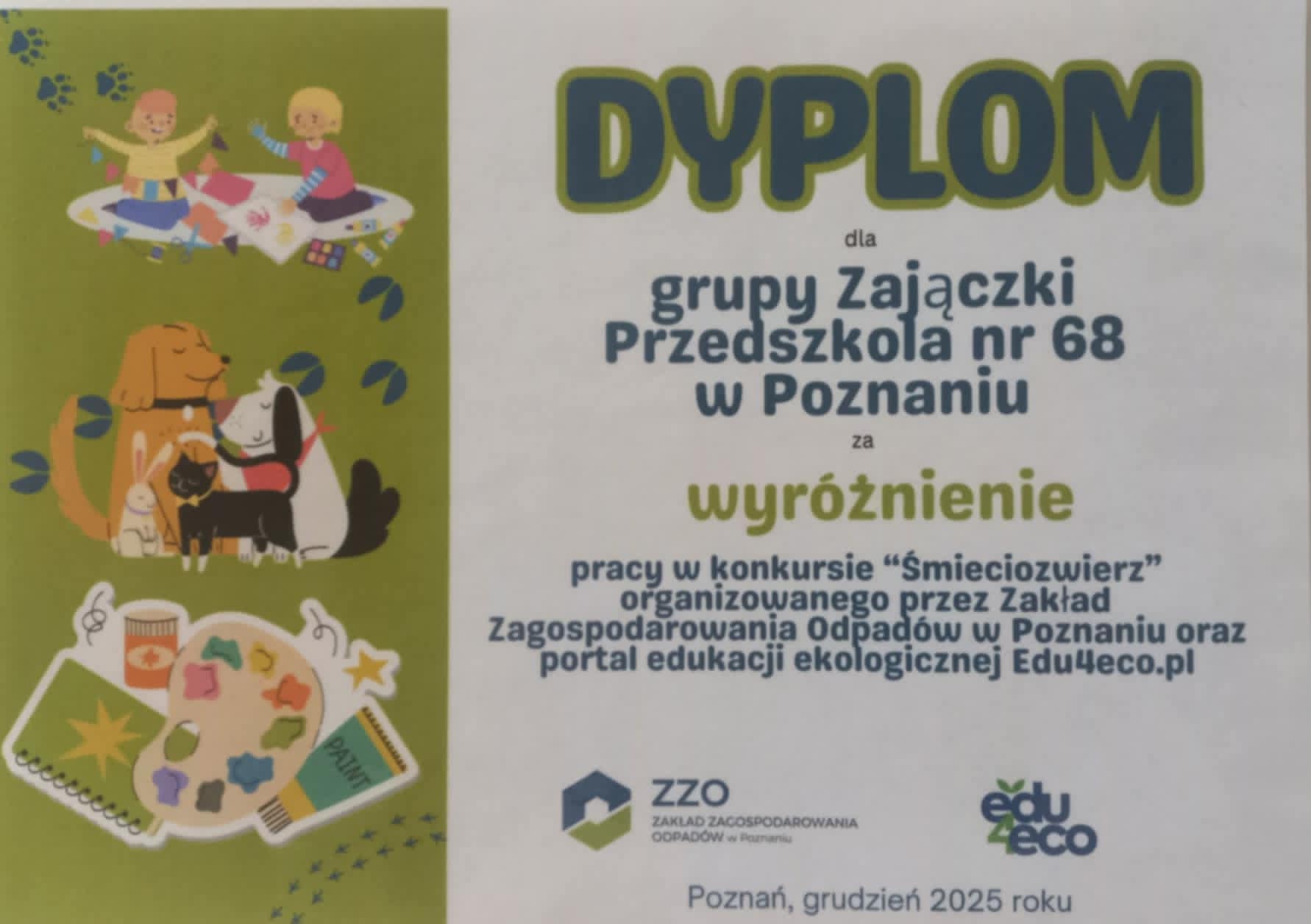 NASZ SUKCES Nasze przedszkole brało udział w Konkursie „Śmieciozwierz” skierowanym dla grup przedszkolnych z terenu miasta Poznania. Organizatorem konkursu był ...