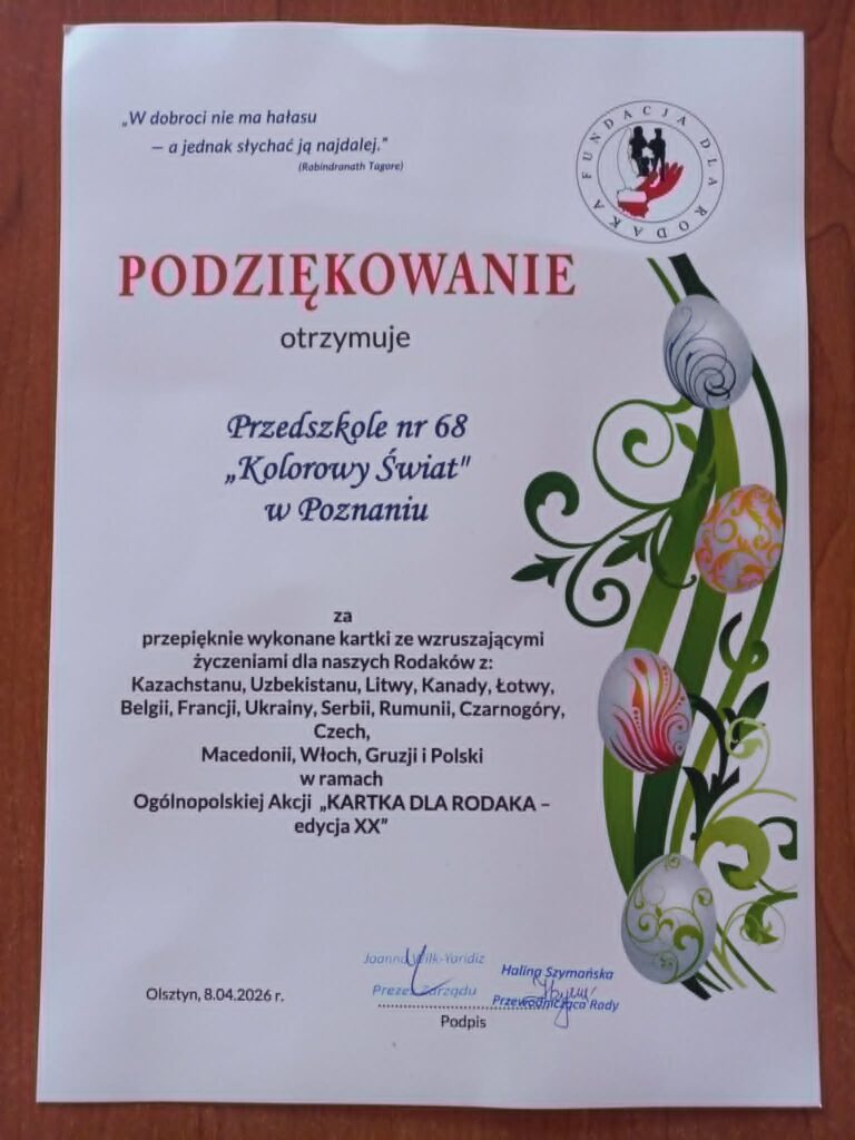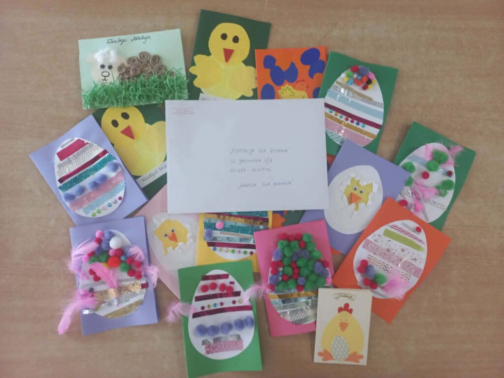 W tym roku szkolnym ponownie włączyliśmy się do Ogólnopolskiej Akcji „KARTKA DLA RODAKA” organizowaną przez FUNDACJĘ DLA RODAKA. Przepiękne, własnoręcznie wykonane przez dzieci wraz z nauczycielkami świąteczne kartki z życzeniami z okazji Świąt Wielkanocnych trafiły do naszych Rodaków mieszkających poza granicami kraju. Zwykła kartka i proste życzenia. Każda z nich była gestem pamięci, życzliwości i serca skierowany do Polaków mieszkających daleko od Ojczyzny i są dla nich dowodem na to, że Polska cały czas o nich pamięta.